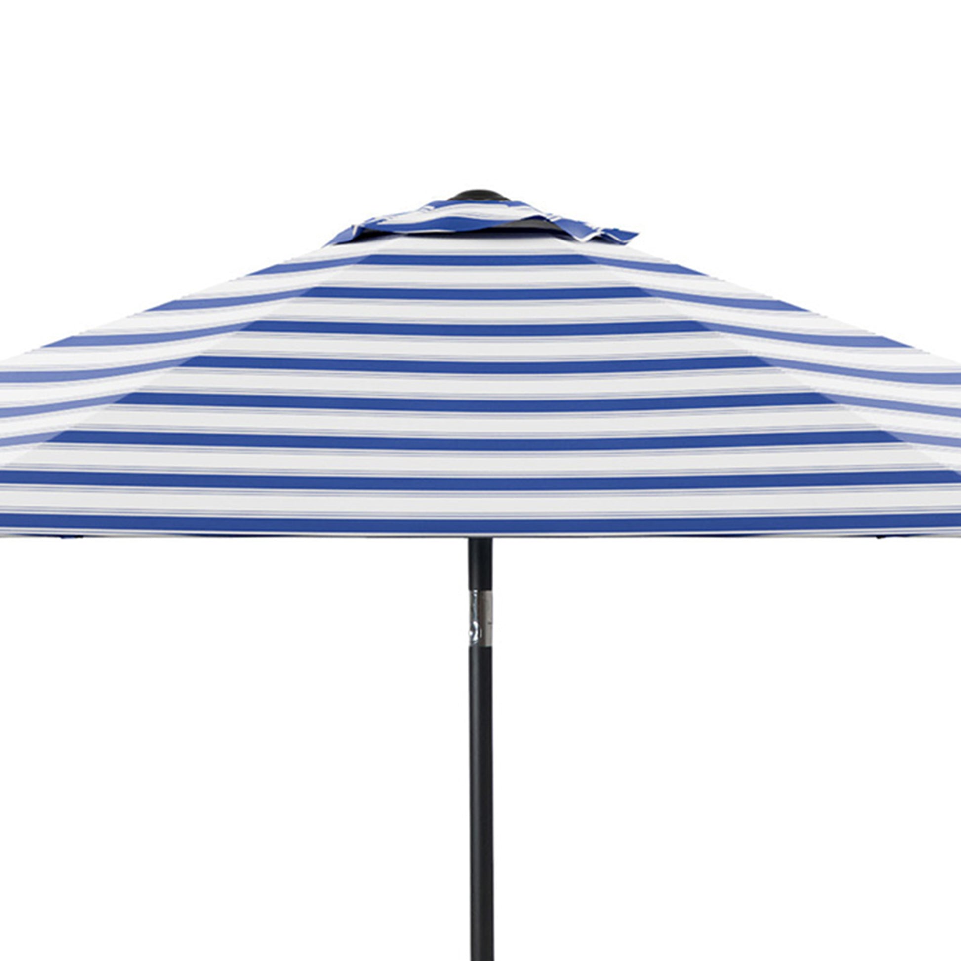 Elevate your outdoor experience with this stylish 106" blue and white market umbrella, thoughtfully designed to blend contemporary aesthetics with everyday functionality. The vibrant blue and white fabric canopy brings a fresh, coastal-inspired look to your patio, garden, or poolside space, while the sturdy black metal frame ensures lasting durability and support. Equipped with a tilt-adjustable articulated joint, this umbrella lets you easily control shade direction throughout the day—providing optimal comfort in changing sunlight. The sleek silver iron legs add a touch of modern sophistication and enhance stability on a variety of surfaces.