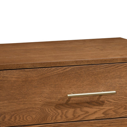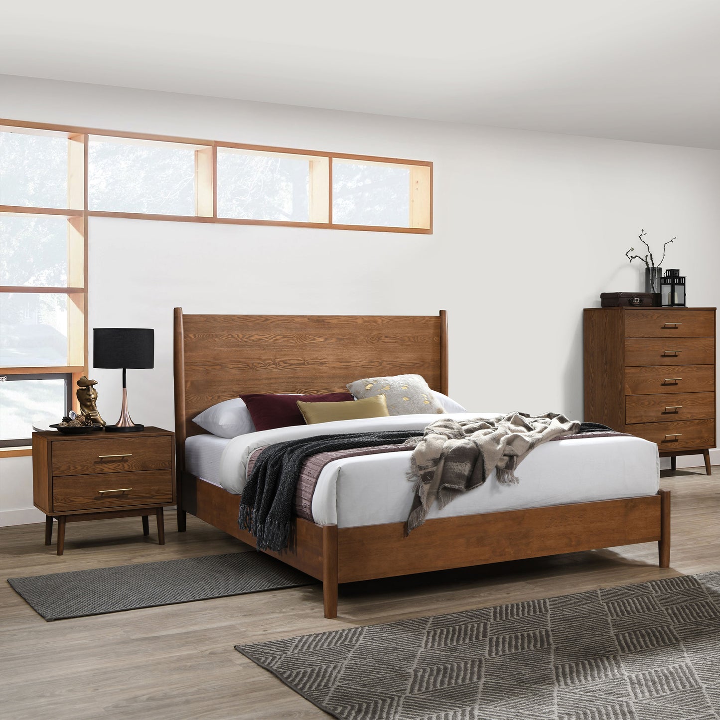 Add timeless charm and smart functionality to your bedroom with this 23" mid-century modern walnut night stand. Crafted from solid wood, wood veneer, and quality materials, it features a rich walnut finish that highlights the clean lines and retro-inspired design.Round tapered legs give it a signature mid-century look, while the gold appliance-style drawer pulls add a touch of modern sophistication. The drawers are accented with nickel bar pulls on the case goods and include an anti-tip interlock system for enhanced safety—making this nightstand as practical as it is stylish.