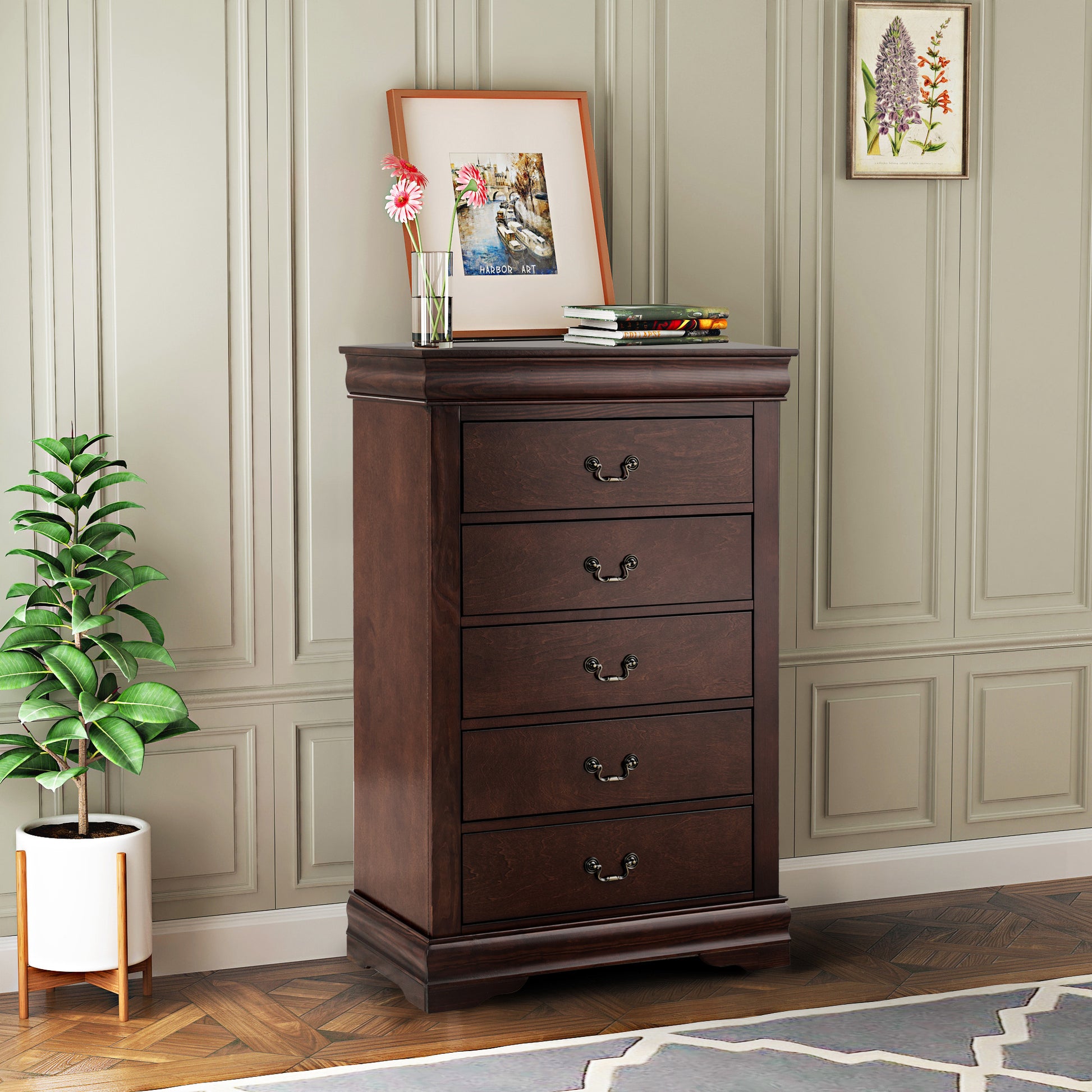 Add rich elegance and practical storage to your space with this 31.5"W Dark Cherry Transitional Chest. Constructed from solid wood, wood veneer, and quality materials, this chest features English dovetail drawers with classic hanging pulls, offering smooth functionality and timeless appeal. The dust-proof case design keeps your belongings clean and protected, while the sculpted bracket feet add refined detail and stability. Finished in a warm dark cherry tone, this transitional-style chest blends seamlessly into both traditional and contemporary interiors. Ideal for storing clothing, linens, or bedroom essentials, it’s a beautiful and functional addition to any room.