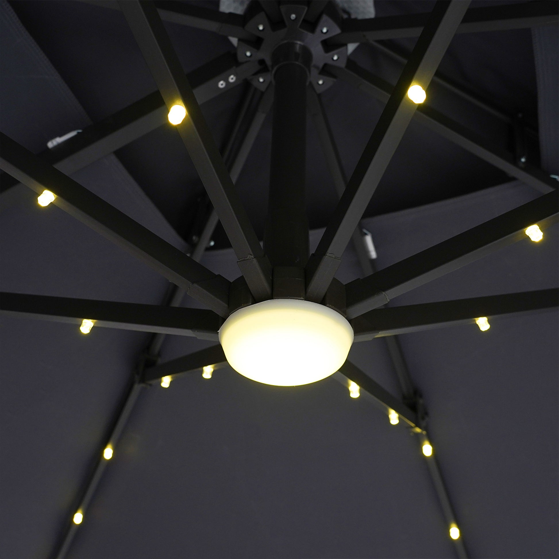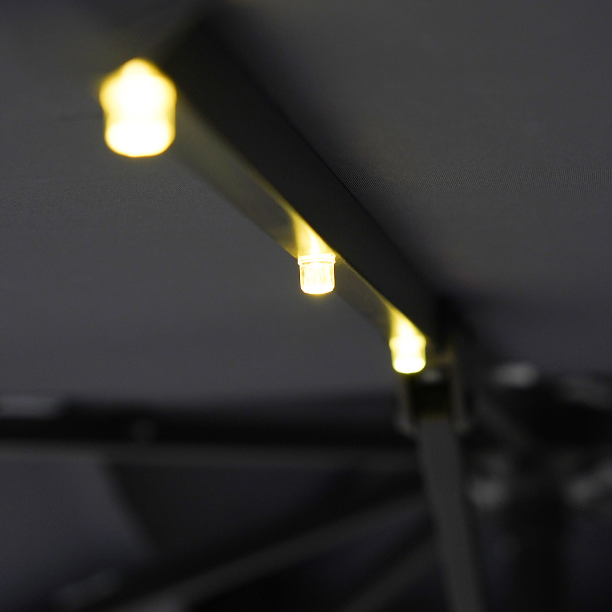 Light up your evenings and stay shaded during the day with this 8 ft gray square patio umbrella, designed for modern outdoor living. Featuring a double top canopy for enhanced airflow and a built-in LED lighting system, this umbrella is perfect for creating a comfortable and inviting atmosphere from day to night. Crafted from weather-resistant polyester fabric and supported by a sturdy aluminum frame, it ensures long-lasting durability and performance. The integrated solar panel powers the LED lights, offering eco-friendly illumination with no need for external wiring. A heavy-duty 37" large base is included to keep the umbrella securely in place—even on breezy days.
